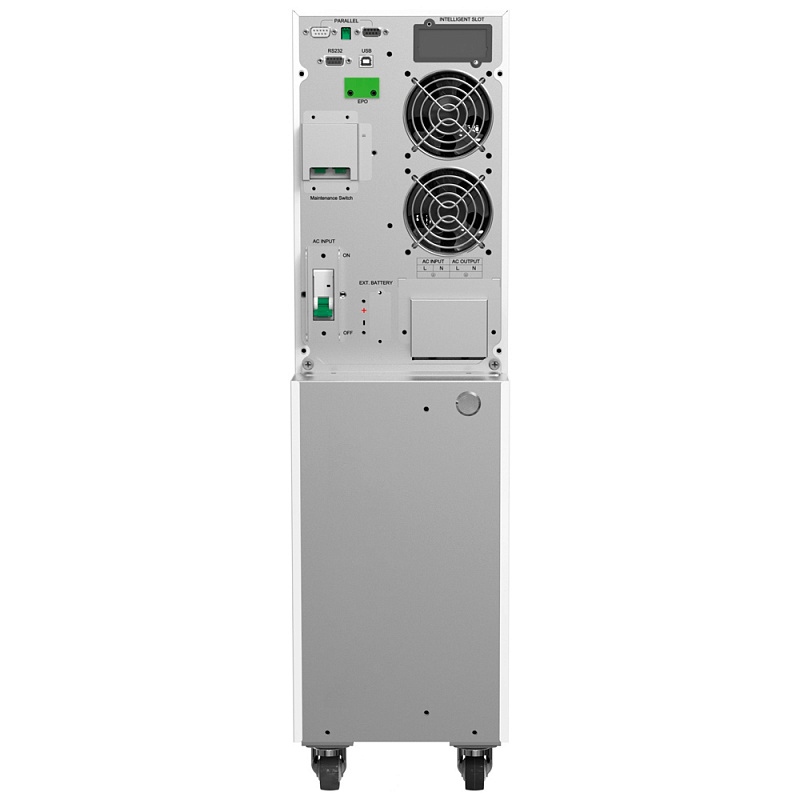 Универсальная коммутация: На задней панели расположен полный спектр интерфейсов для мониторинга и управления, включая сетевые розетки IEC, порты USB и RS-232, слоты для SNMP, клеммы «сухих контактов» и разъем аварийного отключения (EPO).